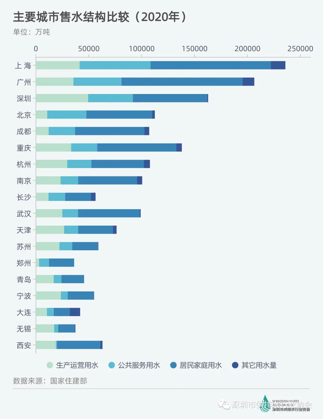 除了各地的供水量、售水量以外,《年鑒》中還統(tǒng)計(jì)了多項(xiàng)供水?dāng)?shù)據(jù),所以,為了更好地比較城市之間的用水情況,我們接下來引入生產(chǎn)運(yùn)營用水量、公共服務(wù)用水量、居民家庭用水量以及漏損水量等數(shù)據(jù):