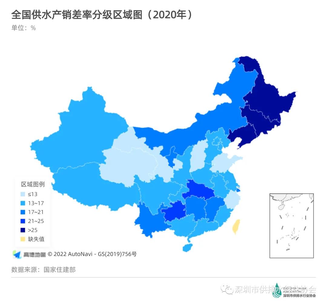 2020年全國公共供水的產(chǎn)銷差率是16.24%,其中,各省、直轄市的差異很大,如下圖: