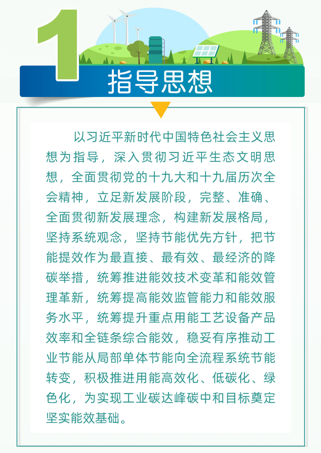 指導思想是以習近平新時代中國特色社會主義思想為指導,深入貫徹習近平生態文明思想,全面貫徹黨的十九大和十九屆歷次全會精神,立足新發展階段,完整、準確、全面貫徹新發展理念,構建新發展格局,堅持系統觀念,堅持節能優先方針,把節能提效作為最直接、最有效、最經濟的降碳舉措,統籌推進能效技術變革和能效管理革新,統籌提高能效監管能力和能效服務水平,統籌提升重點用能工藝設備產品效率和全鏈條綜合能效,穩妥有序推動工業節能從局部單體節能向全流程系統節能轉變,積極推進用能高效化、低碳化、綠色化,為實現工業碳達峰碳中和目標奠定堅實能效基礎。