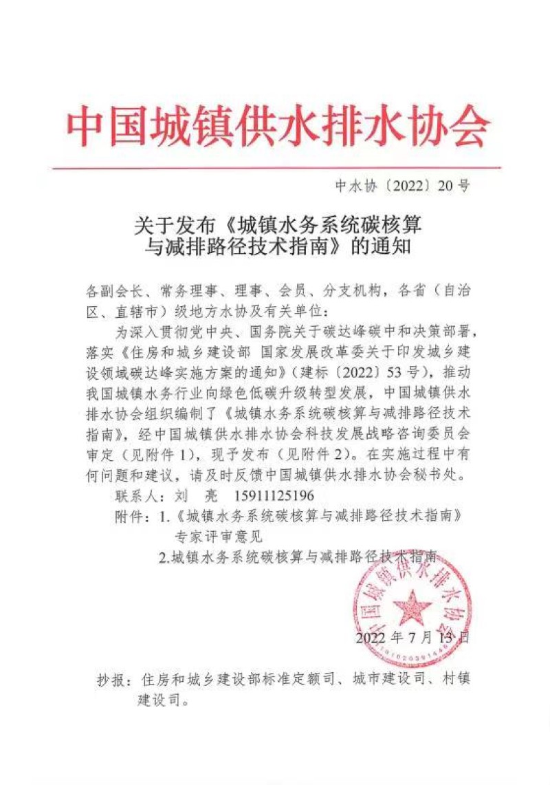 為深入貫徹黨中央、國務院關(guān)于碳達峰碳中和決策部署,落實《住房和城鄉(xiāng)建設部 國家發(fā)展改革委關(guān)于印發(fā)城鄉(xiāng)建設領(lǐng)域碳達峰實施方案的通知》(建標〔2022〕53號),推動我國城鎮(zhèn)水務行業(yè)向綠色低碳升級轉(zhuǎn)型發(fā)展,中國城鎮(zhèn)供水排水協(xié)會(以下簡稱中國水協(xié))組織北京建筑大學、北京首創(chuàng)生態(tài)環(huán)保集團股份有限公司、北京城市排水集團有限責任公司、中建環(huán)能科技股份有限公司、中國市政工程中南設計研究總院有限公司、哈爾濱工業(yè)大學等單位編制了《城鎮(zhèn)水務系統(tǒng)碳核算與減排路徑技術(shù)指南》(以下簡稱指南),現(xiàn)予發(fā)布。